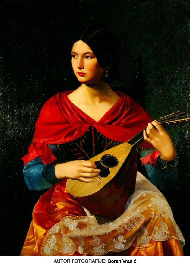 Premda za potpuni doživljaj i užitak u ovom djelu nije presudno koje zapravo glazbalo Rimljanka svira, ipak neće biti naodmet da se nepobitno utvrdi o čemu je riječ i da se uklone nesporazumi. U navedenim citatima raznih autora zamjećujemo kako se uporno ponavlja u naslovu slike izraz lutnja. Međutim, kao što je to nedvojbeno dokazao Alex Timmermann riječ je o mandolini. Povjesničar glazbala sasvim je određen: »Napuljska mandolina koju Karasova Rimljanka drži u rukama ima četiri dvostruke žice, jasno vidljive iznad tamnog drveta hvataljke i zaštitne pločice pokraj zvučnog otvora. Broj žica odgovara broju čivija umetnutih na stražnjoj strani glave. Takve čivije nećemo naći ni na jednoj lutnji. Ornamenti i intarzije nalik su ukrasima karakterističnima za napuljsku mandolinu koja se razvila oko 1745. godine i odmah postala vrlo popularnom. Zanimljivo je uočiti da mandolina na Karasovoj slici ima deset metalnih pragova na hvataljci, što znači da se radi o kasnom primjerku svoje vrste koji je bio izrađen vjerojatno krajem 18. stoljeća. To potvrđuje i činjenica da je tijelo glazbala dublje nego kod većine sačuvanih napuljskih primjeraka. «[15] Autor navodi niz primjera nerazlikovanja trzalačkih glazbala i iz njih proizašlih pogrešaka, čak i u publikacijama i muzejima s glazbalima, te taksativno nabraja specifičnosti Karasova glazbala. »To doista sasvim sigurno nije lutnja koja je više nego dvostruko veća od mandoline. Jedina njihova zajednička crta su zaobljena leđa i glasnjača u obliku badema. Posjedujući sve karakteristike napuljske mandoline, Karasovo se glazbalo još više razlikuje od lutnje. Opremljeno je sa četiri para metalnih žica koje su pričvršćene na dnu korpusa znatne dubine. Tu je i široka završna kapica na dnu, kao i zaštitna kapica koja glasnjaču čuva od oštećenja nastalih zbog sviranja trzalicom, a redovito se nalazi samo na nagnutim glasnjačama ranih tipova mandoline. Glava je plosnata, a čivije gledaju prema natrag. Lutnje ne posjeduju niti jednu od navedenih karakteristika.«[16] I ranije su poznavatelji zamjećivali pogrešku u nazivu slike i nastojali je ispraviti. Tako je Anka Simić-Bulat u bilješci uz osvrt na izložbu Portreti 1800 – 1870 napisala: »Iako je već ranije bilo ustanovljeno da glazbeni instrument kojeg drži Rimljanka nije lutnja, već karakterističan tip napoletanske mandoline, veoma rasprostranjena u Italiji u Karasovu vremenu, ipak se poradi već ustaljenog naziva zadržao stari naslov. Primjerak takve vrste mandoline čuva se u zbirci glazbenih instrumenata u Muzeju za umjetnost i obrt u Zagrebu.«[17] (sličnu napomenu nalazimo pored naslova Rimljanka s lutnjom u katalogu izložbe Slikarstvo u Karlovcu u devetnaestom stoljeću, održane u Gradskom muzeju Karlovac 1978. godine) a Alex Timmermann u više spomenutom članku piše kako je »već 1973. godine u časopisu Oko bilo ispravno upozoreno da se zapravo radi o mandolini.«[18] (pretpostavljam također u svezi izložbe Portreti 1800 – 1870). Za potpuni prikaz zabluda koje su pratile naziv Karasove slike – a očito je kako pogreška potječe od Ivana Kukuljevića Sakcinskog – navest ću malo poznati podatak iz dokumentacije Hrvatskog povijesnog muzeja. Tu nalazimo još neprecizniji termin, Srećemo ga u popisu naslovljenom »Izkaz onih predmeta koji se mogu posuditi za izlaganje na Gospodarskoj izložbi 1864. godine.« Na popisu koji je sastavio Mijat Sabljar, upravitelj Narodnog muzeja od 1862. do svoje smrti 1866. godine, pod rednim brojem 5. (pod brojevima 2., 3., i 4 također su zabilježene Karasove slike) nalazi se bilješka: »Slika sjedeće Talijanke s gitarom, poveća slika u širokom pozlaćenom okviru od slikara Karasa.«[19]